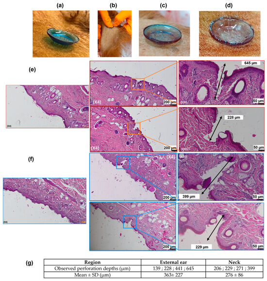 Histological analysis of both tissue types confirmed successful MN penetration through the stratum corneum into the dermal layer (Figure 8e–g). Although additional studies are warranted to reinforce these findings, preliminary observations suggest that MN perforation in the neck tissue was generally less deep (276 ± 86 µm) than in the ear (363 ± 227 µm), but more reproducible.
