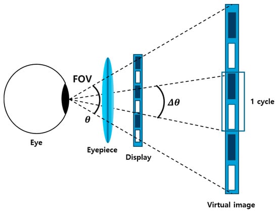 As can be seen in Figure 1, in the fundamental near-eye display configuration, the eyepiece lens functions as an optical magnifier that projects the image from a display panel into the viewer’s eye, creating a magnified virtual image at a comfortable viewing distance. This simple free-space-type arrangement forms the basis of most AR/VR headsets or glasses, where the primary role of the optics is to enlarge the panel while preserving its visual quality. Within this framework, two of the most critical performance metrics are the angular resolution and angular FoV. The angular resolution quantifies how finely visual details can be distinguished across that field, while angular FoV determines how wide a scene can be perceived by the user. These can be defined by the following equations: