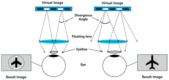Relation between the eyebox size, divergence angle, and optical power of the floating lens in a basic NED configuration.