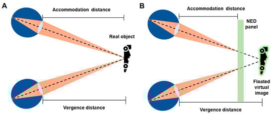 VAC issue of an NED. (A) VAC-free stereoscopic viewing case when observing a natural real object. (B) VAC-occurring stereoscopic condition when observing an NED panel.