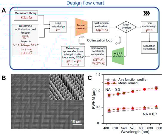Inverse design of a large-scale achromatic broadband metalens. (A) Design work flow. (B) An SEM image of the fabricated metalens. (C) Broadband achromatic focusing properties obtained from simulation and measurement. Figures (A–C) are reproduced with permission from Ref. [24], Nature Publishing Group, under a Creative Commons Attribution 4.0 International License.