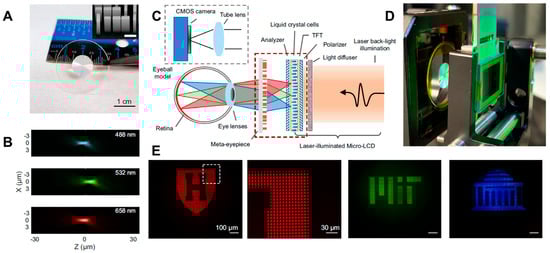 To highlight the application potential of their platform, the authors further demonstrated a VR NED integrating their centimeter-scale RGB achromatic metalens as an eyepiece. As shown in Figure 6, paired with a laser-illuminated micro-LCD, this system projects high-resolution RGB images onto the eye with reduced chromatic aberrations and increased focusing efficiency (compared to the previous work [23]). Imaging experiments with static patterns, grayscale scenes, and dynamic video confirmed the system’s capability for full-color VR display with a 60 Hz refresh rate. However, since a singlet metalens eyepiece could not resolve monochromatic (off-axis) aberrations, which is significant to expand the FoV of virtual images, a novel lens design strategy to improve angular resolution or modulation transfer function (MTF) for higher field angles of rays should be studied.