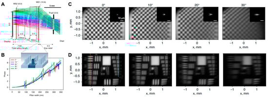 Meta-optics, a next-generation optical element technology leveraging planar arrays of subwavelength meta-atoms to modulate optical wavefronts in free space, has recently emerged as a promising solution to these challenges [9,10,11,12,13,14,15,16,17,18]. Unlike conventional refractive or diffractive optics, meta-optical elements—particularly metasurfaces, two-dimensional metamaterial defined on a transparent substrate—can arbitrarily control the phase, amplitude, and polarization of light within ultrathin form factors, enabling flat and lightweight optical components with high design flexibility [9,10,11,12,13,14,15,16,17,18]. By virtue of this unique capability, meta-optics is expected to replace conventional optical elements and advance a wide range of integrated optical systems. Thus, the field has risen as a key enabler for next-generation AR/VR display systems, particularly in demonstrating eyeglass-type NEDs [19,20,21,22]. To realize practical and user-friendly AR/VR systems, several stringent optical performance metrics must be satisfied, including angular resolution, field of view (FoV), the size of the eyebox, focal cues, transparency, the brightness of virtual images, form factors, weight, and color dispersion, simultaneously [1,2,3,4,5,6].