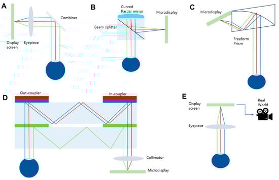 AR display architectures. Schematic diagrams of conventional optical see-through AR display architectures based on (A) a combination of a half-mirror and beam splitter, (B) a birdbath configuration with a beam splitter and curved partial mirror, (C) freeform optics, and (D) a waveguide with grating couplers. (E) Scheme of video see-through AR display.