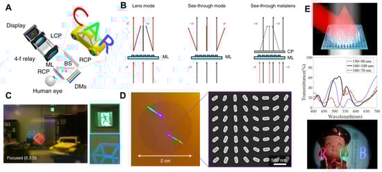 - Liu, Z.; Chen, Y.; Zhang, Q.; Gao, X.; Wang, L. Metasurface Enabled Augmented Reality Display: A Review. Adv. Photonics 2023, 5, 034001. [Google Scholar] [CrossRef]