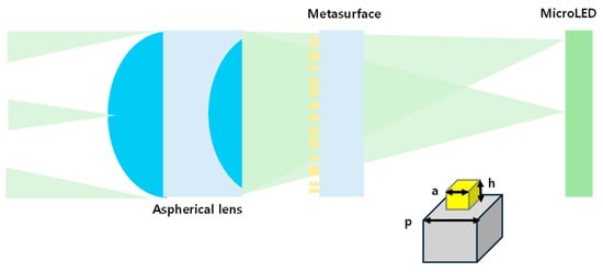 - Chen, E.; Zhou, Y.; Lee, C.; Lee, B.; Rho, J. Broadband Beam Collimation Metasurface for Full-Color Micro-LED Displays. Opt. Express 2024, 32, 10252–10264. [Google Scholar] [CrossRef]