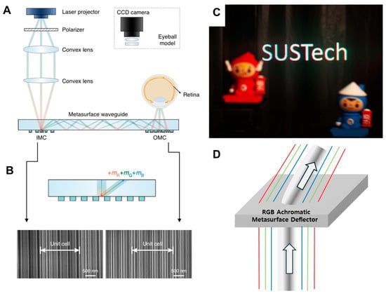 RGB achromatic meta-optic couplers for waveguide AR NEDs. (A–C) Waveguide-type AR with one-dimensional freeform SiN metasurfaces. (A) Scheme of whole system and (B) principle of achromatic diffraction with fabricated SEM images. (C) Measured AR image. (D) Scheme of a-Si:H metasurface deflector with two-dimensional freeform shape [40]. Figures (A–C) are reproduced with permission from Ref. [39], Nature Publishing Group, under a Creative Commons Attribution 4.0 International License.