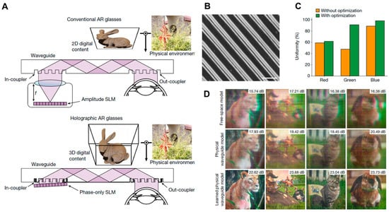 The work, described in Figure 14, by Gopakumar et al. from Prof. G. Wetzstein’s group presents a fundamentally different direction compared to the AMG-based study discussed right above [43]. While both employ inverse-designed metasurface couplers for broadband operation, the work by M. Gopakumar et al. tightly integrates the optical hardware with artificial intelligence–driven holographic algorithms. Its couplers, fabricated in high-index SCHOTT glass (refractive index of 1.8), are optimized not only for high diffraction efficiency and angular uniformity but also for compatibility with coherent holographic propagation (Figure 14A–C). This co-design enables full-color 3D holographic content with accurate depth cues, addressing the long-standing VAC in AR near-eye displays (Figure 14D). In contrast to the AMG approach by S. Moon et al., which prioritizes manufacturability, uniformity control, and scalability, the study emphasizes 3D visual quality and realism by fusing nanophotonic design with a computational imaging technique. In particular, from a systems perspective, this work is oriented toward holographic AR, demonstrating compact full-color 3D reconstruction with advanced image formation models calibrated via camera-in-the-loop learning with a physics-informed convolutional neural network model.