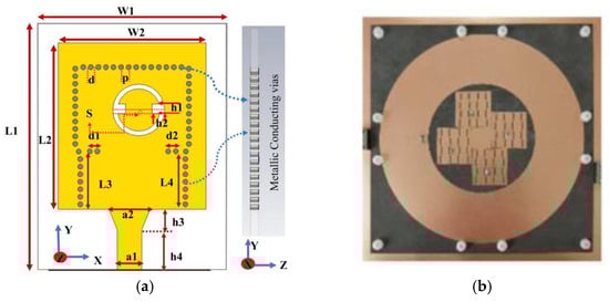 (a) CPW antenna integrated on an EBG structure [94]. (b) ACS antenna [95].