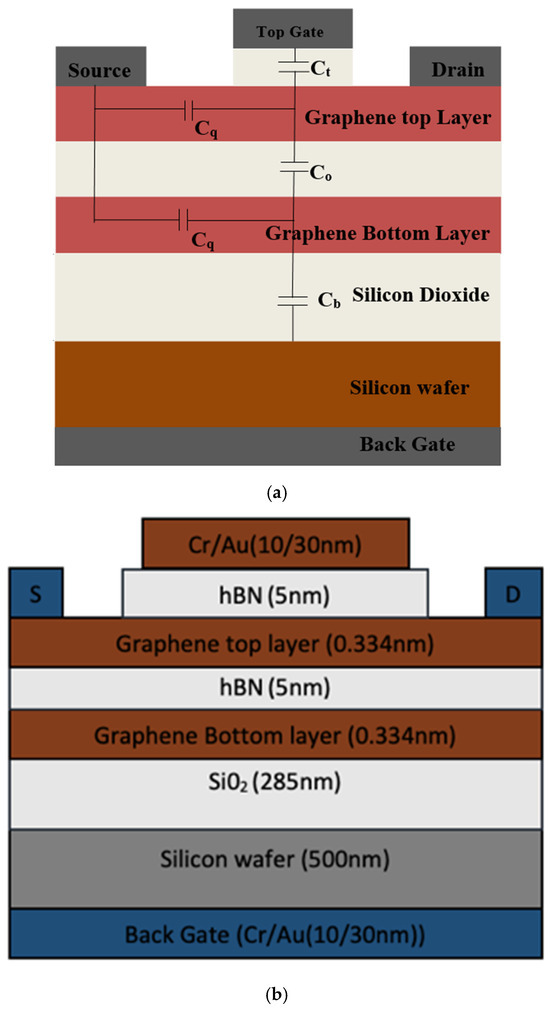 Basic block diagram of the proposed model Bi-GFET with the layers, quantum capacitance, and oxide capacitance shown in (a) and their thickness shown in (b).