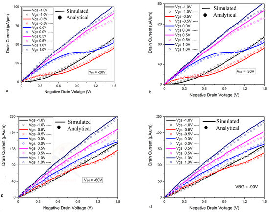 The nonlinear output characteristics of Bi-GFET with back-gate contact-induced control and dual-gate vertical electric field effect have been shown at various back-gate voltages. (a) shows the negative output characteristic curve at = −20 V and illustrates the nonlinear line of drain current over a range of top-gate voltage (−1.0 V to 1.0 V). (b–d) illustrate the negative characteristic curve at = −30 V, −60, −90 V respectively and represent the nonlinear characteristic behavior over a range of top-gate current (−1.0 V to 1.0 V) [25,28].