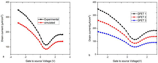 (a) Simulation model calibration against the experimental GFET. (b) shows the transfer characteristic; i.e., the change in the drain current with different ON/OFF ratios of the current conduction.