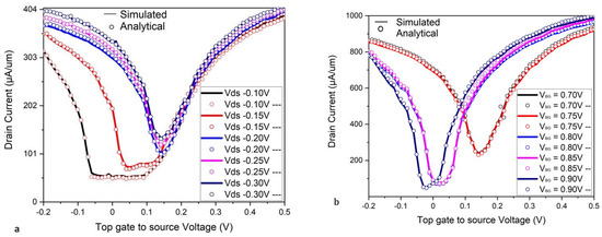 The doping has also shown the ambipolar nature of Bi-GFET; as shown in Figure 4a, the transfer characteristic curves of the proposed model depicts the increasing ambipolarity. To explore the ambipolar nature, as well as the effect of the drain voltage observed with the enhanced control of top gate, the Bi-GFET is simulated at five different drains to the source voltage ( = 0.1, 0.15, 0.2 V, 0.25 V, and 0.3 V) as shown in Figure 4a. The nonlinear transfer characteristics of the Bi-GFET with the back-gate contact-induced control and dual-gate vertical electric field effect have been shown at various back-gate voltage in Figure 4b. When is increased, ambipolarity of the input curve also increases. Initially, a back gate biased () at a very low back-gate voltage (0.71 V) is analytically calculated with the measured data for the transfer characteristic and simulated at the TCAD tool for validation.