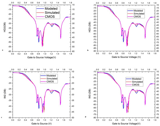 The measured and simulated data have shown good agreement with the available literature and have less than 10% normalized root mean square (NRMS) error between the measured and simulated data. The transfer characteristic curve of Bi-GFETs shows a high linearity with a gradual increase in the drain-to-source voltage biasing. Harmonic distortion (HD) and intermodulation distortion (IM) of the proposed analytical model are compared with the simulated model and conventional MOSFET of the second order and the third order in Figure 5. HDs of the second order with varying top-gate voltages are presented in Figure 5a. HDs of the third order with varying top-gate voltages are presented in Figure 5b. HDs of the third order are low in comparison to the second order. HD of the proposed analytical model and simulated model are very much similar while conventional MOS has indifference values. Intermodulation distortions of the second order with varying top-gate voltages are presented in Figure 5c. Intermodulation distortions of the third order with varying top-gate voltages are given in Figure 5d.