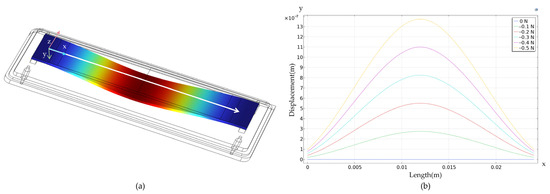 After setting up the model parameters, meshing, and conastraints, a tensile force of F = 0.5 N is applied to the cantilever beam. The tensile force F = 0.5 N was selected as it represents the upper limit of typical silk thread tension during weaving processes (0.3–0.6 N) [1]. This value ensures validation of sensor performance under high-stress conditions while operating within the linear range of the sensor (0–1 N). The force F is transmitted to the cantilever beam through the cylindrical surface of the yarn guide roller A, with the contact surface being a line contact. The resulting deformation and stress distribution are shown in Figure 4a,c, where blue indicates the minimum strain and red the maximum strain regions. Figure 4b shows the displacement variation from 0 to 0.5 N at the center line of the base. This data was obtained through parameter scanning. Figure 4d shows corresponding stress changes in the substrate under the same force range.
