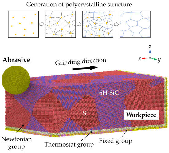 For polycrystalline materials, the deformation mechanism can be different from that of single crystals. Pradhan et al. [14] studied the wear-resistance behavior in polycrystalline Pt-Au under a hard grinding ball using MD simulation. They discussed the effect of adding atomic concentrations of Au at the grain boundaries (GBs) on the wear process. Their results indicate that the segregation of Au to the GBs of nanocrystalline Pt leads to an improvement in the slab’s anti-wear behavior, suggesting that the underlying wear mechanism is adhesion-dominated. Goel et al. [15] conducted an MD simulation of nanometric cutting on polycrystal Si and revealed that GBs facilitate the amorphization and formation of irregular nanogrooves on the machined workpiece. Liu et al. [16] investigated the material removal behavior of polycrystal 3C-SiC during nano-scratching using MD simulation. They revealed that grain geometry and GBs in the polycrystalline workpiece could affect the internal stress state and suppress the phase transition process, which causes different subsurface damage patterns with single crystals. Meng et al. [17] built an MD model to study the friction mechanism during the nano-grinding of hot-pressed SiC, which is composed of 3C-, 4H-, and 6H-SiC grains. They revealed that the machinability of hot-pressed SiC is determined by the microstructure-related intergranular slip motion and grain fragmentation. Recently, Liu et al. [18] conducted grooving experiments and MD simulation to study the machining mechanisms of RB-SiC under various temperatures. Their results indicate the significance of property mismatch between phases in nanoscale machining. For brittle materials such as Si and SiC, the material removal mechanism is determined by the tool geometry parameters, including rake angle and edge radius [19,20]. However, in the above-mentioned research, the effect of tool geometry on the material removal behavior of RB-SiC was not mentioned, and the coupling deformation mechanism of Si and SiC phases under different tool shapes has not been fully revealed.