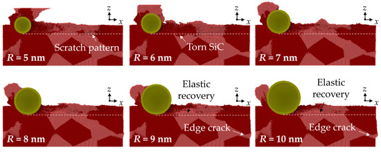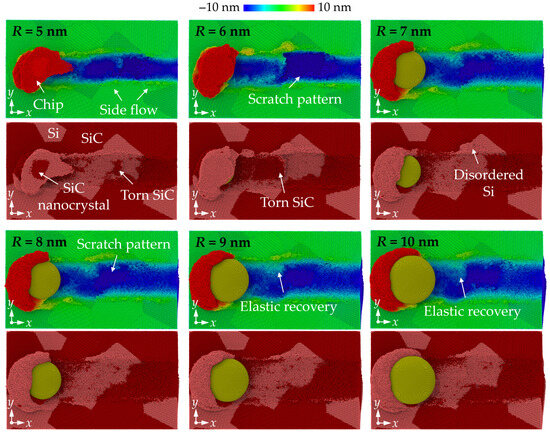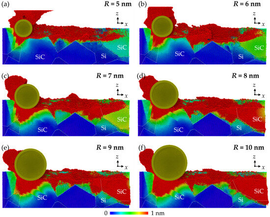 The height distribution and morphology of the machined workpiece are shown in Figure 2. The property mismatch between Si and SiC introduces obvious surface structures at the phase boundaries, which is distinct to the machined surface on single crystals [31]. Chips and side flow show an apparent irregular profile since different removal mechanisms are involved when machining Si and SiC phases. When small abrasives (R = 5 nm and 6 nm) are used, the surface swelling of SiC is observed as the abrasive moves from the SiC to the Si phase due to the bending and tearing of SiC at the interfaces. SiC nanocrystals are observed in chips because of the polycrystallization process. These hard nanocrystals are responsible for the formation of scratch patterns on the Si machined surface. As the abrasive radius increases, no obvious tearing of materials are observed at the interfaces, and the side flow is distributed more uniformly near the machined surface. Scratch patterns are still obvious, indicating the existence of SiC polycrystallization, while the surface swelling is mainly formed by Si atoms, which can be identified as the elastic recovery effect. It is revealed that for brittle materials such as Si and SiC, the highly compressed materials could be restored to their balanced position during unloading, causing deviation of the machined surface to the theoretical value [32].