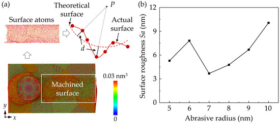 The cross-sectional view of workpiece is shown in Figure 3, with the Si and SiC phases identified. In the MD simulation, the material removal thickness ranges from several to tens of nanometers, which indicates that the material is probably removed in the ductile mode. It can be concluded that the surface error is mainly caused by elastic recovery and scratch patterns due to the property mismatch between phases. When machining from SiC to Si, the torn SiC generated at the interface could move with the abrasive and collapse by the following SiC grain, while elastic recovery is more apparent when machining from the Si to SiC phase. When abrasives of a larger size are used, cracks are observed at the margin of the workpiece, which is caused by sliding of the SiC grains. To measure the effect of different swelling mechanisms on surface integrity, the surface roughness was calculated based on the positions of the surface atoms, which are identified according to the atomic volume (shown in Figure 4a). The surface atoms usually have a large atomic volume based on the Voronoi algorithm [33]. The surface roughness, Sa, can be estimated via the following equation [33]: