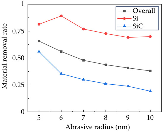 Figure 5 shows the calculated material removal rate as the grinding distance reaches 65 nm, which is calculated by counting the number of atoms in the deformation region. It is observed that compared to SiC, the Si phase has a higher removal rate due to lower hardness and brittleness. Meanwhile, the downward sliding of the SiC grains also contributes to the smaller material removal rate of SiC. As the abrasive size increases, the material removal rate gradually decreases. This variation can be explained by the fact that the sharp edges from smaller abrasives suppress the elastic deformation of the workpiece material and promote the concentrated plastic deformation in the machining region.