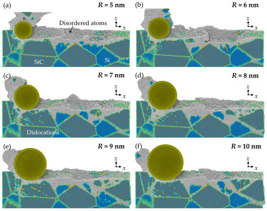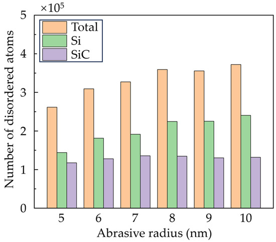For a clear view of the crystal structure in the subsurface workpiece, the workpiece structure was identified via improved common neighbor analysis (CNA) [34], as shown in Figure 7. The white atoms are the disordered atoms, which mainly contain amorphous phase and defective structures. It can be seen that SiC nanocrystals are formed on the machined surface and chips due to the polycrystallization process, while most disordered phases are Si atoms generated by the high-pressure phase transition (HPPT). As the abrasive advances, the disordered Si atoms can stock and squeeze into the boundaries at the interfaces. When abrasives with larger size are used, the HPPT of Si is promoted, and the squeeze of the disordered Si becomes more obvious. Figure 8 shows the number of disordered atoms after grinding. It is observed that as the abrasive radius increases, more disordered Si atoms are generated, while the variation of disordered SiC atoms is slight. This result indicates that raising the abrasive radius enhances the HPPT of Si, while its influence on SiC is inapparent.