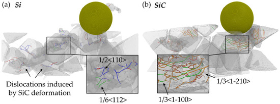 Snapshots of the dislocations in the (a) Si and (b) SiC grains of the workpiece machined by an abrasive with a 10 nm radius.