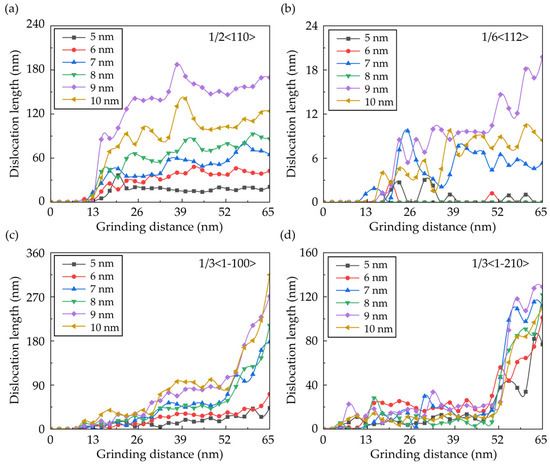 Variation of the dislocation length in a workpiece machined by abrasives with different radii: (a) 1/2<110> dislocations in the Si phase; (b) 1/6<112> dislocations in the Si phase; (c) 1/3<1-100> dislocations in the SiC phase; and (d) 1/3<1-210> dislocations in the SiC phase.