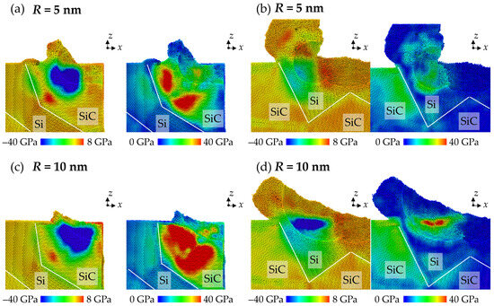 The stress distribution when machining across the phase boundaries with abrasives with radii of (a,b) R = 5 nm and (c,d) R = 10 nm.