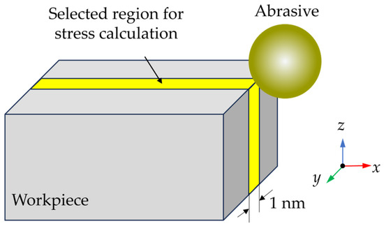To investigate the dynamic stress state, the average stress in workpiece during grinding was calculated, since varying the abrasive radius could change the scale of the deformation region. A slice with 1 nm thickness in the middle of the workpiece was selected to calculate the average stress, as shown in Figure 12. The calculated average stress is shown in Figure 13. The internal stress increases obviously when the abrasive contacts with the hard SiC grains. When the abrasive size increases, the internal stress raises obviously, especially when machining SiC grains. As the abrasive size increases from 5 nm to 10 nm, the average compressive stress increases by 184%, and the average von Mises stress increases by 140%.