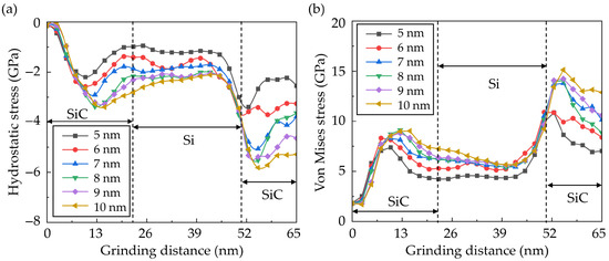 The average (a) hydrostatic stress and (b) von Mises stress of the selected region during nano-grinding with abrasives of different sizes.