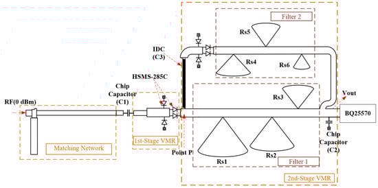 where is the efficiency of the 1st-Stage VMR, k is the proportion of residual high-frequency energy, and is the efficiency of the 2nd-Stage VMR. The second term in Equation (8) represents the additional contribution from recycled harmonic energy. Because the entire harvesting path is implemented with planar microstrip and surface-mounted diodes, this architecture is inherently compatible with MEMS and thin-film integration for compact RF–DC converters.