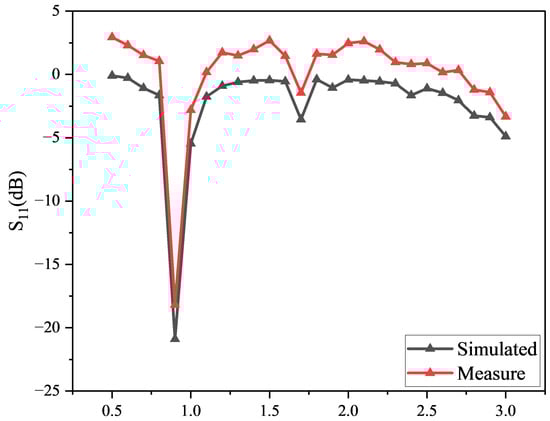Due to their compact size, light weight, and ease of integration, microstrip lines are widely used as filters in wireless communication and microwave integrated circuits. In the HR-P-RFEH system, both the microstrip-matching network and the 2nd-Stage VMR are implemented using planar microstrip technology compatible with MEMS processes. The microstrip-based matching network enables broadband and stable impedance tuning, effectively addressing the limitations of traditional lumped-element-matching networks. As shown in Figure 2, the simulation results demonstrate that the reflection coefficient drops below at the target frequency, significantly reducing input power loss and improving overall RF-to-DC conversion efficiency. The planar configuration also allows the design to be readily fabricated using standard photolithography and thin-film metallization techniques, enhancing its manufacturability for large-scale integration.