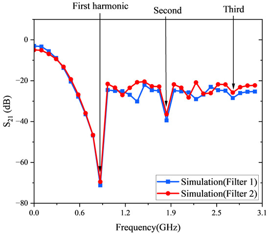 To evaluate the harmonic suppression behavior, the S21 parameter of the 2nd-Stage VMR is analyzed. As shown in Figure 3, the stage includes two filters—Filter1 and Filter2—each targeting specific harmonic ranges. Filter1 suppresses the fundamental, as well as the second and third, harmonics, redirecting residual energy through the DC-blocking capacitor into Filter2. Filter2 further attenuates any remaining harmonic components, ensuring a smoother and more stable DC output. As a result, the 2nd-Stage VMR produces prominent suppression bands in the S21 transmission response. The rejection depths and bandwidths are determined by the microstrip geometry, which is fully compatible with standard MEMS lithographic and metallization techniques. In practice, fabrication tolerances in stub length and microstrip width may cause slight resonance shifts and matching degradation. Nevertheless, tolerance analysis with ±5% dimensional variations showed less than 3% deviation in rectification efficiency, confirming robustness against typical PCB and MEMS lithography errors. Moreover, since the stubs operate as quarter-wave resonators directly integrated at the rectifier input, their suppression effect depends primarily on guided wavelength rather than the polarization or incident angle of the incoming RF field. This ensures that the harmonic recycling mechanism remains effective under both fabrication and excitation variations, supporting stable performance in real-world deployment scenarios.