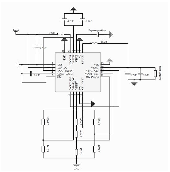 In most rectifier modules, the rectified DC output is approximately 1 V, which is insufficient to directly drive typical IoT loads such as wireless sensor nodes. To enable efficient accumulation and regulated supply of such weak harvested energy, a low-power and highly adaptive power management unit is required [19]. In this work, the Texas Instruments BQ25570 chip is adopted as the core of the power management module, based on the following design considerations:
