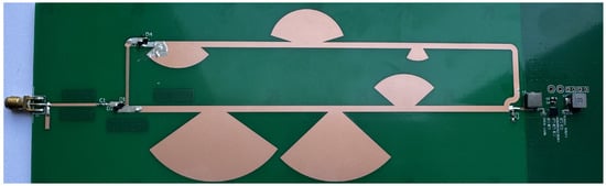 The HR-P-RFEH system was implemented on an FR4 substrate. Figure 5 shows the fabricated prototype. All transmission lines, resonant stubs, and interdigital capacitors are realized in a planar layout, enabling straightforward scaling to wafer-level fabrication. Electromagnetic simulations in ADS Momentum were used to co-optimize geometry and impedance, ensuring minimal mismatch and precise frequency alignment. This design methodology—simulation-driven, planar, and photolithography-ready—allows for rapid translation from PCB prototyping to MEMS-compatible microfabrication.