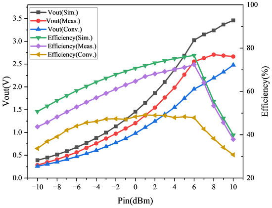 Figure 6 compares the measured and simulated DC output voltage and rectification efficiency for the proposed HR-P-RFEH and a conventional single-stage rectifier. At 0 dBm input and 915 MHz, the proposed system delivers a stable DC output of approximately 1.4 V with negligible ripple. This corresponds to a rectification efficiency of 70.7%, an improvement of 16.4% over the baseline design. The 22.5% increase in output voltage and 16.4% improvement in efficiency at 0 dBm confirm that the harmonic recycling path effectively redirects residual harmonic energy into useful DC power, demonstrating its practical contribution to overall energy utilization.