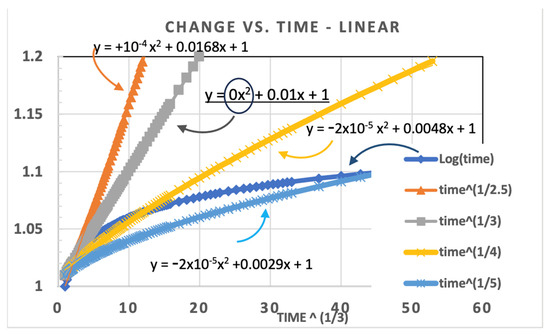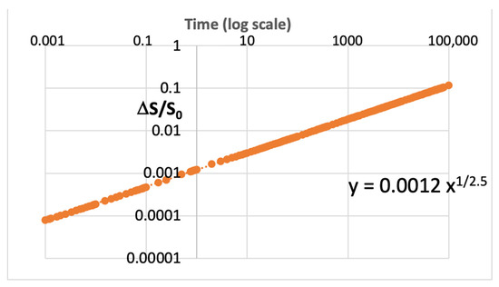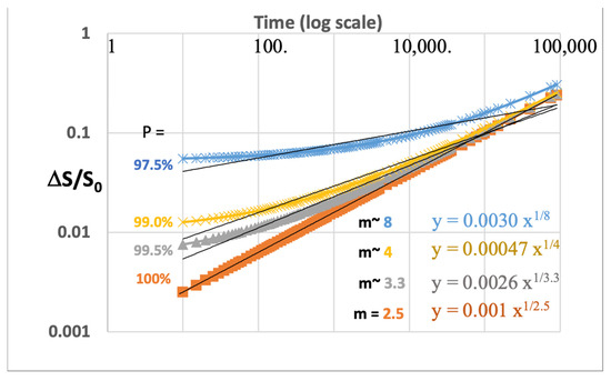 0. These plots show the least squares calculations for m based on a linear fit from the log–log plots using Equation (3) for the Y value. We see that the values of m~8 in the root law for the time axis, where the error in S