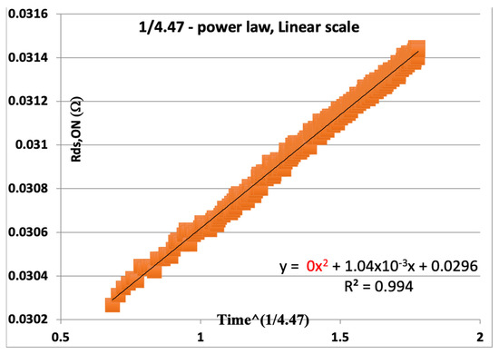 X-axis should be the transformed time to the power 1/m, as we see from Equation (4); thus, Y = F(t), as the raw data from the measured frequencies directly from the FPGA.
