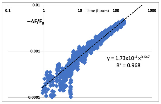 The assumed degradation here is understood to be a decrease in the frequency over time, so we use Equation (1) to assume a power-law decrease in frequency over time. The difference in the frequency is then normalized by F0 as per Equation (3) to calculate Y. X, of course, is the time on a log scale. We see the data plotted as per the instructions of McPherson, and the data looks very linear on a log–log scale. Then we use the Excel trendline function to calculate the trend to extrapolate time to fail. We see what looks like an excellent and proper fit to a power-law trendline with y = 1.73 × 10−4 t0.647. We can then find that m = 1/0.647 = 1.5456.