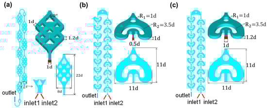 In contrast, the reference AFR-1 (Figure 1b) employs a simplified U-shaped obstacle paired with a single turbulent cylinder—the former redirects flow through sharp turns while the latter provides basic flow recombination—implemented in reduced channel dimensions to assess the inlet size effects. Its modified counterpart, AFR-2 (Figure 1c), maintains the DDR’s channel height and inlet width while preserving the U-cylinder configuration, serving as a direct performance benchmark that isolates geometric influences from scale factors. This carefully structured comparison enables a precise evaluation of how splitting complexity (DDR vs. U-cylinder designs) and dimensional scaling (AFR-1 vs. AFR-2) independently affect the mixing efficiency and pressure drop characteristics.