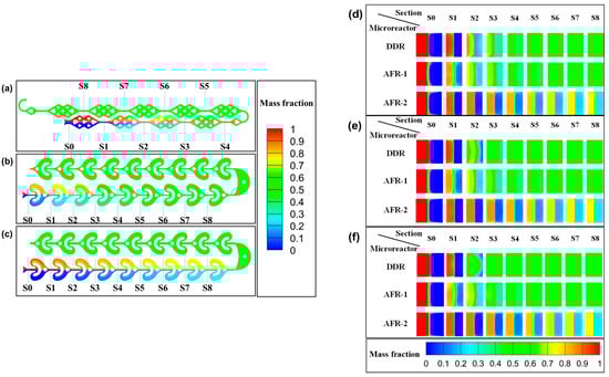 Figure 5. Different longitudinal sections of mass fraction contours in (a) DDR, (b) AFR-1, and (c) AFR-2 at different total flow rates: (d) 20 m L · m i n 1 , (e) 40 m L · m i n 1 , (f) 60 m L · m i n 1 .