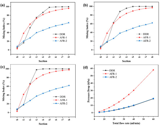 Pressure characteristics (Figure 6d) confirm DDR maintains this superior mixing at a three-times pressure drop than AFR-1 at 60 m L · m i n 1 .