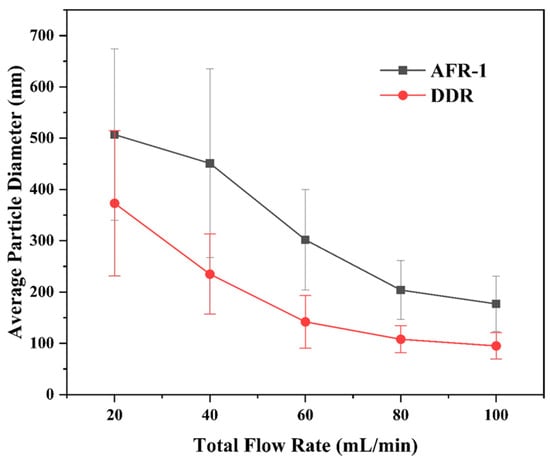 46% smaller average size at 100 m L · m i n 1 flow rate (95 nm vs. AFR-1’s 177 nm, as shown in Figure 9, Figure 10e and Figure 11e);