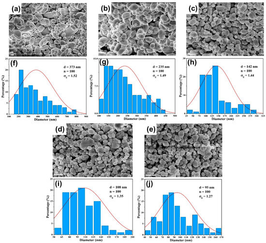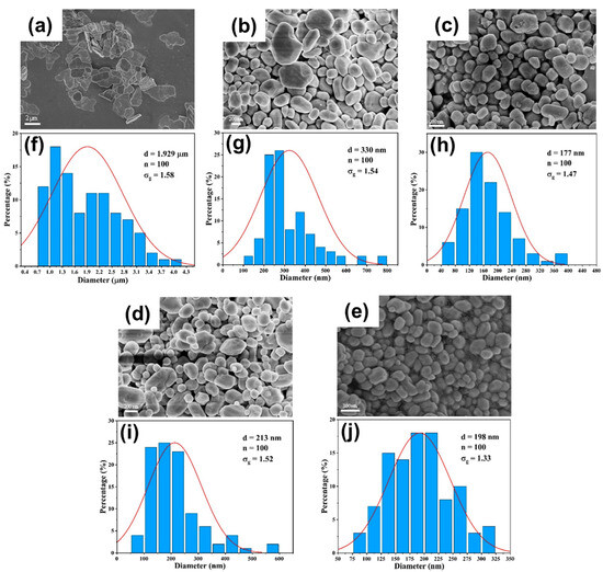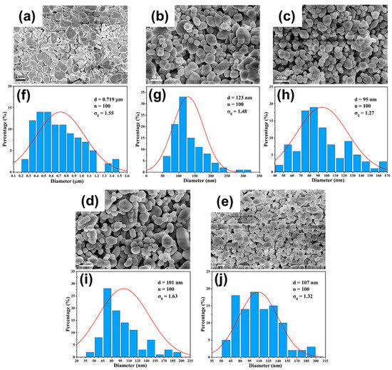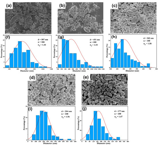 Figure 14. (ae) SEM images and (fj) particle size distribution of BaSO4 nanoparticles at different precursor concentrations in DDR: (a,f) C B a 2 + = C S O 4 2 = 0.1   m o l / L ; (b,g) C B a 2 + = C S O 4 2 = 0.3   m o l / L ; (c,h) C B a 2 + = C S O 4 2 = 0.5   m o l / L ; (d,i) C B a 2 + = C S O 4 2 = 0.8   m o l / L ; (e,j) C B a 2 + = C S O 4 2 = 1   m o l / L ; Q t o t a l = 100   m L · m i n 1 .