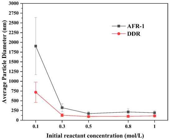 In this section, the effect of precursor concentration on the preparation of BaSO4 nanoparticles in AFR-1 and DDR was examined. The conditions were as follows: the total flow rate was 100 m L · m 1 , the flux ratio of the two reactants was 1, and C B a 2 + varied from 0.1 to 1 mol/L.