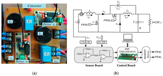 The converter implementation, including key components and layout, is depicted in Figure 8a. The schematic of the experimental setup is presented in Figure 8b, which includes the DSP TMS320F28335 used to implement the proposed control scheme, the signal sensing board, the MOSFET driver stage, and the converter topology. Furthermore, Figure 8c shows the complete experimental setup.