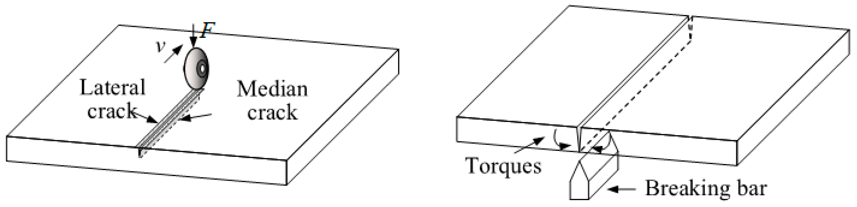 - Hasegawa, R.; Matsusaka, S.; Hidai, H.; Chiba, A.; Morita, N.; Onuma, T. In-process estimation of fracture surface morphology during wheel scribing of a glass sheet by high-speed photoelastic observation. Precis. Eng. 2017, 48, 164–171. [Google Scholar] [CrossRef]