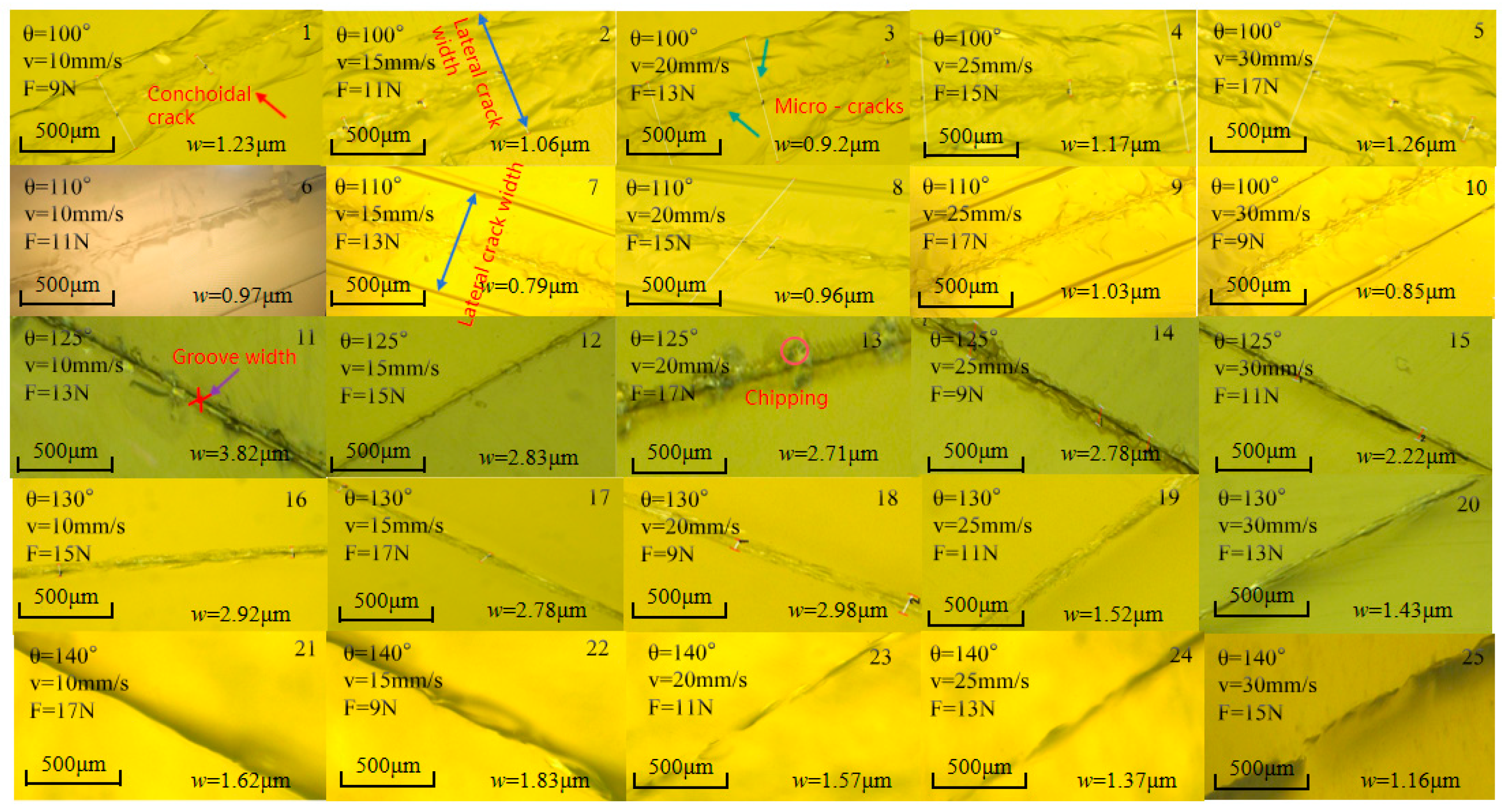 - Kim, J.; Park, S.; Lee, J. Optimization of scribing parameters for glass substrates using orthogonal array and analysis of variance. J. Mater. Process. Technol. 2016, 231, 220–227. [Google Scholar]