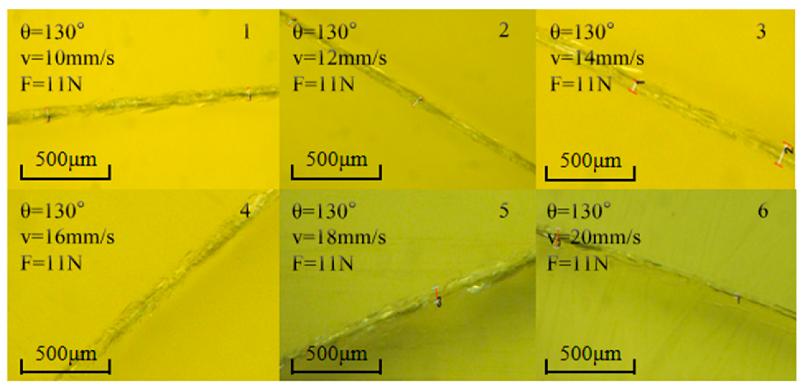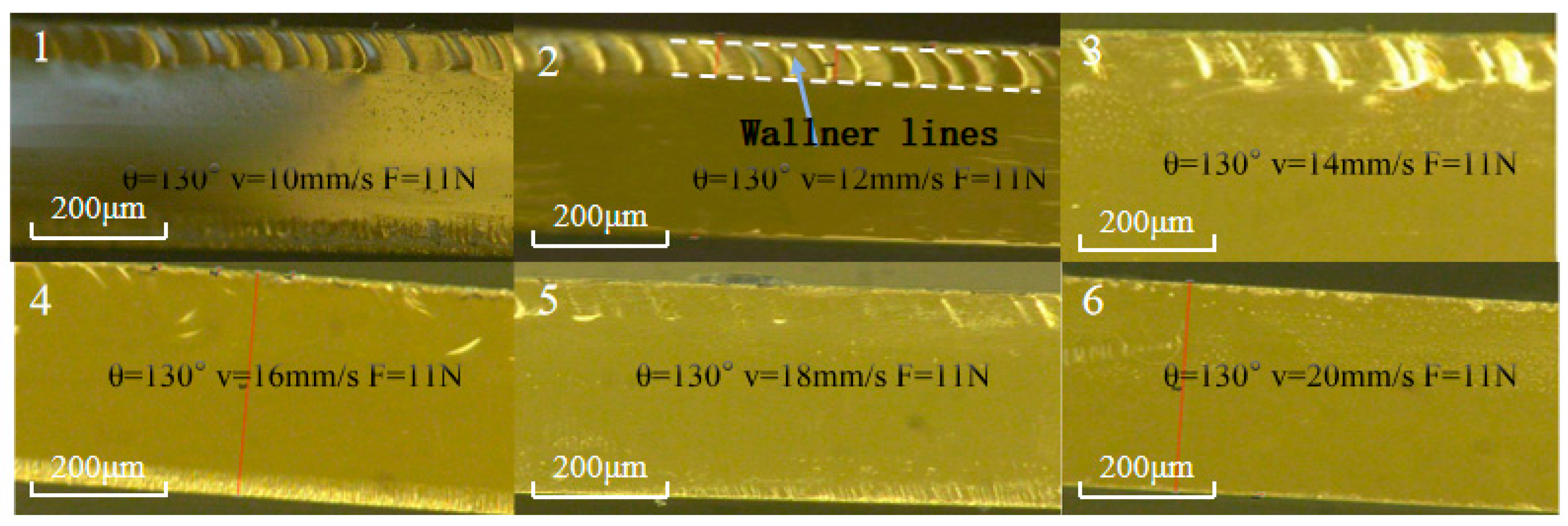 4.2.1. Influence of Cutting Speed on Cutting Surface Morphology and Transverse Cracks