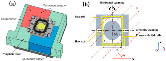 Vertical scanning of the mirror is achieved using an electromagnetic (EM) drive. A pair of permanent magnets is arranged along the Y direction of the structure to establish a uniform magnetic field, rather than an inclined one. This drive scheme is selected for the slow axis because piezoelectric actuators typically exhibit limited displacement and low efficiency under quasi-static or low-frequency conditions, whereas electromagnetic drives provide a more linear response and greater travel under similar conditions.