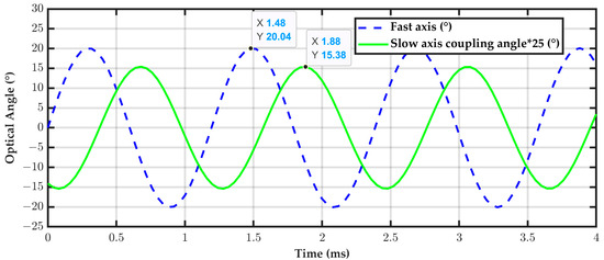 Mechanical coupling generates residual oscillations in the slow-axis direction, leading to unintended optical deflection. The peak slow-axis coupling angle is approximately ±0.615°. For phase comparison purposes, the slow-axis coupling angle has been amplified 25 times, as shown as ±15.38 in Figure 2, while the fast-axis deflection angle is ±20°. The scan line will appear in the output in a discrete form, commonly referred to as an “elliptical line”. Such parasitic motion has been proven to adversely affect scanning accuracy, indicating an inherent crosstalk problem in single-coil electromagnetic mirror designs.